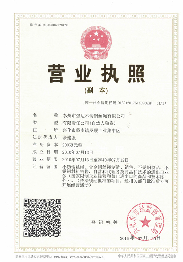 泰州市強達不銹鋼絲繩有限公司位于江蘇興化市戴南經(jīng)濟開發(fā)區(qū),公司致力于不銹鋼絲繩產(chǎn)品生產(chǎn),立志成為“國內(nèi)技術(shù)標桿型吊索具生產(chǎn)企業(yè)”。以此戰(zhàn)略思想指導(dǎo),公司堅決貫徹“質(zhì)量贏市場,管理增效益,誠信贏天下”的質(zhì)量方針。以完善的服務(wù)在國內(nèi)不銹鋼絲繩市場樹立良好的品牌形象。公司榮獲“江蘇省質(zhì)量信得過企業(yè)。 靈活的管理機制,經(jīng)驗豐富的